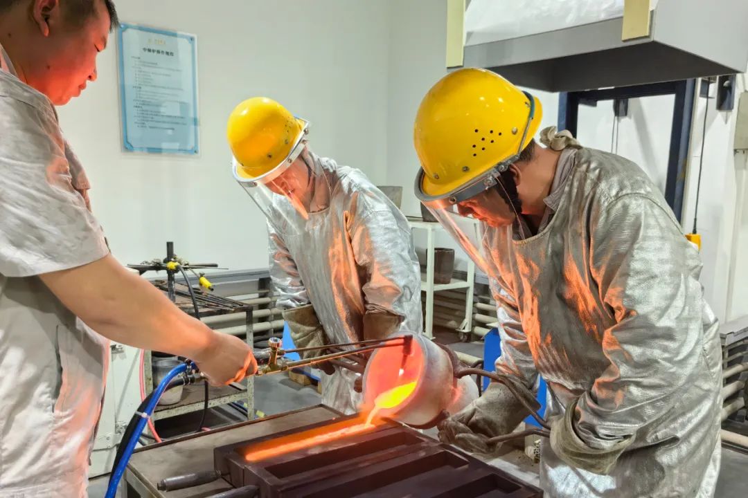 一小時(shí)后,坩堝中的金料已經(jīng)變成了金水,張文龍喊了兩位同事,共同進(jìn)行澆鑄這一環(huán)節(jié)。其中一位同事李玉奇,今年52歲,在工廠已經(jīng)十年了,算是張文龍的師父。他們都做好全身防護(hù),戴上安全頭盔,放下面罩,二人合力將坩堝抬起,將金水倒入模具中。