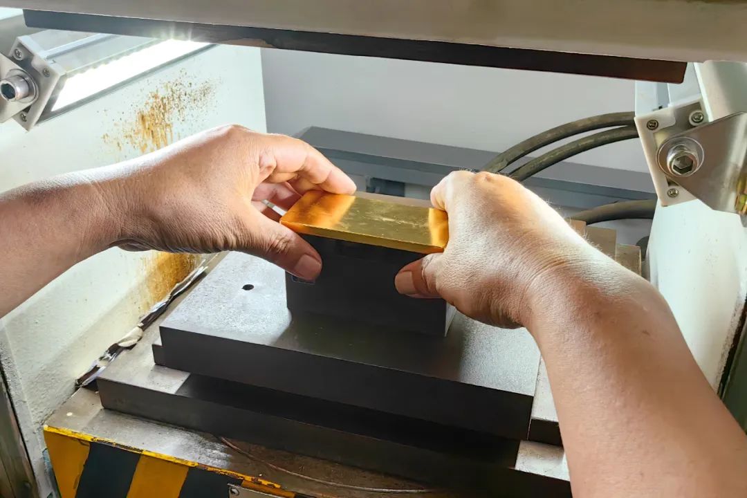 等金錠擦拭完畢,后續(xù)要在金錠上打鋼印,算是給每塊金錠一個(gè)身份認(rèn)證。最后在經(jīng)過表觀檢驗(yàn)之后,這樣一塊1千克的標(biāo)準(zhǔn)金錠就可以出貨了。